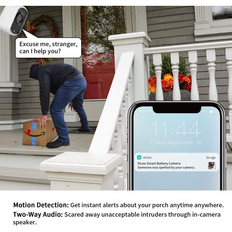 -【AI Motion Detection & Two Way Audio】 Smart wifi camera supports flexible motion sensitivity set up allows only receive notifications on person events exclusively, no false alarms from flying bugs. While Two-way audio let you see and talk to the “someone”on your property.